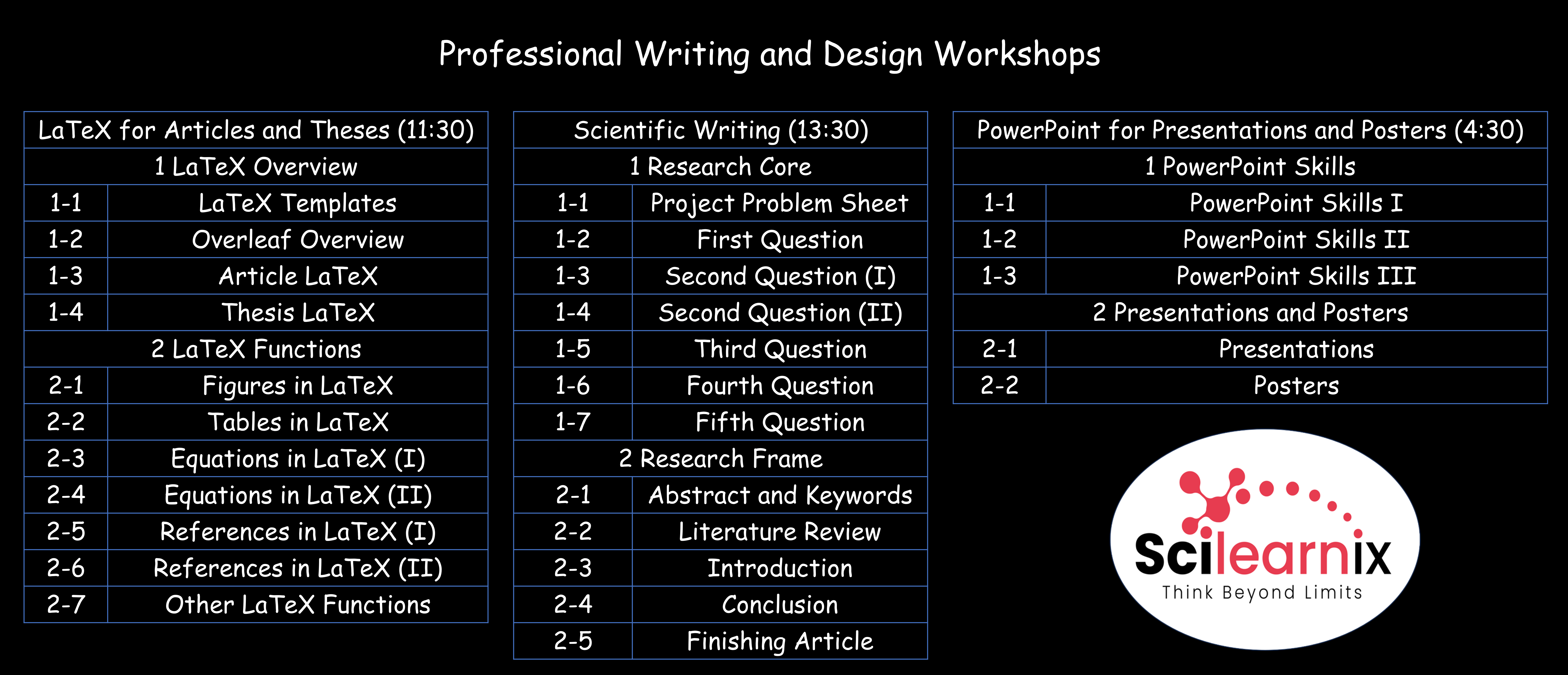 This all-in-one bundle provides essential skills for academic success, combining three practical courses: LaTeX for Articles and Theses, Scientific Writing, and PowerPoint for Presentations and Posters. Participants will learn how to professionally typeset documents in LaTeX, write clear and structured scientific papers, and design compelling presentations and posters. Ideal for students, researchers, and professionals aiming to publish, present, and communicate their work with clarity and impact.